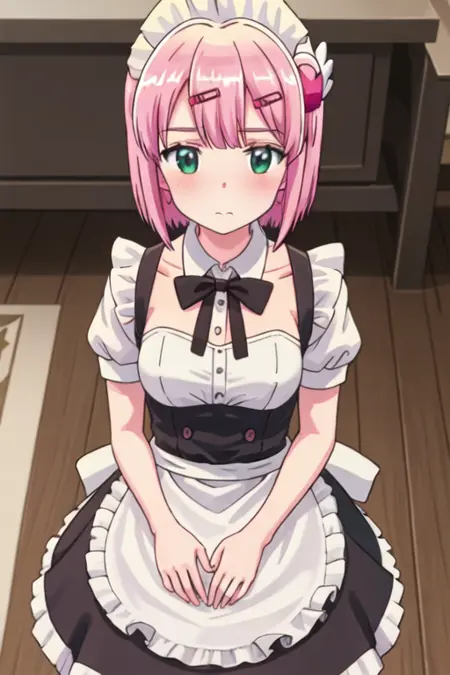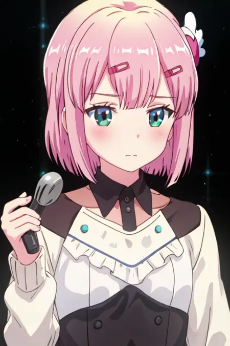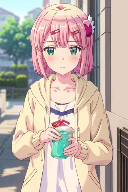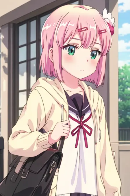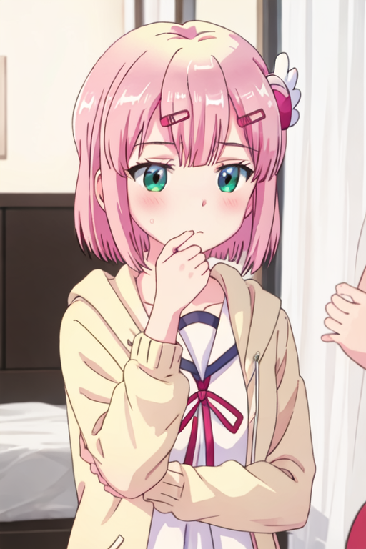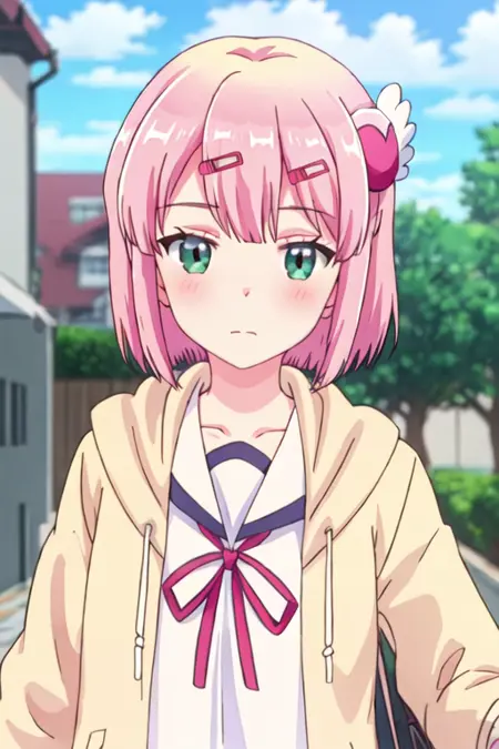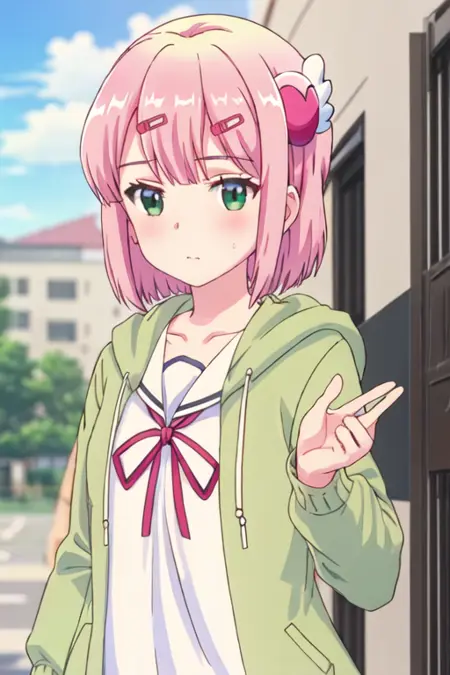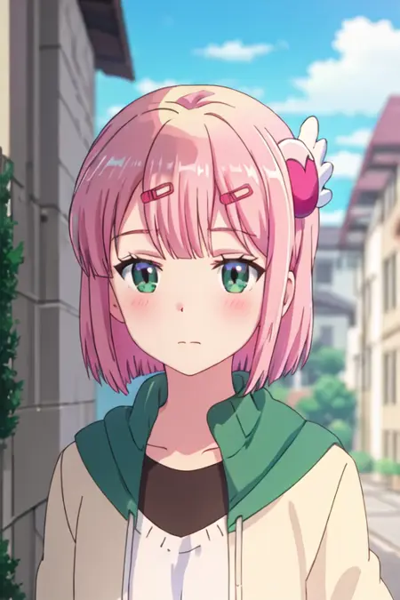 The trigger word is chiyoda_momo_thedemongirlnextdoor, and the recommended tags are best quality, masterpiece, highres, solo, {chiyoda_momo_thedemongirlnextdoor:1.15}, pink_hair, short_hair, hair_ornament, blush, hairclip, closed_mouth, bangs, shiny_hair, green_eyes.