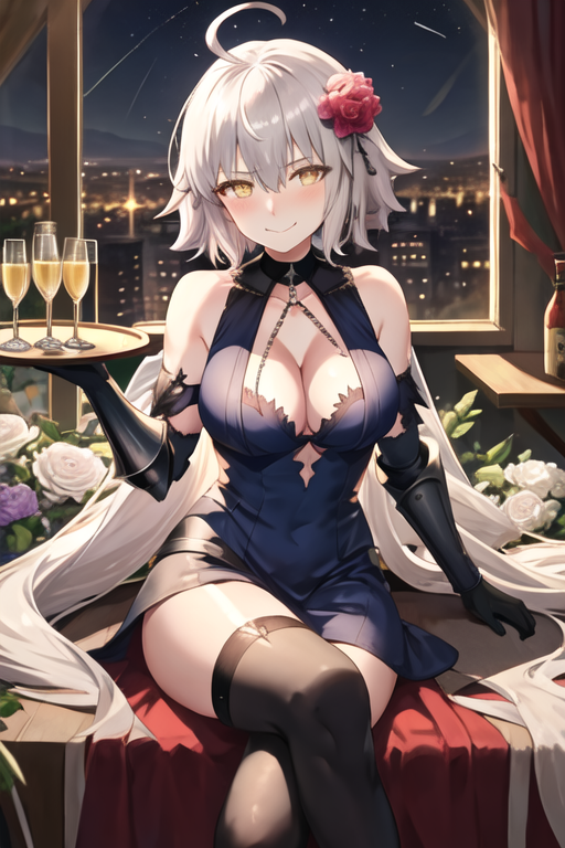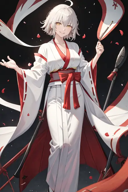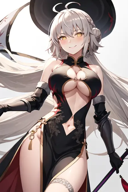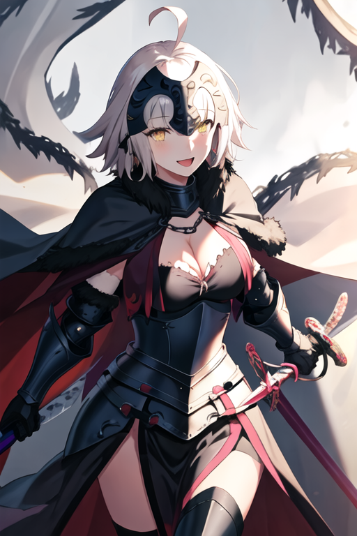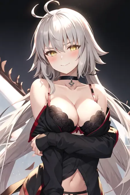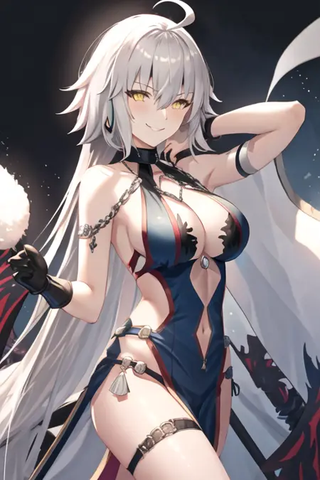 触发词为 jeanne_d_arc_alter_fgo,推荐标签为:best quality, masterpiece, highres, solo, {jeanne_d_arc_alter_fgo:1.15}, yellow_eyes, breasts, ahoge, bangs, large_breasts, white_hair, long_hair, smile, cleavage, short_hair, hair_between_eyes, very_long_hair, grey_hair。