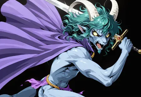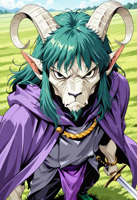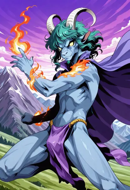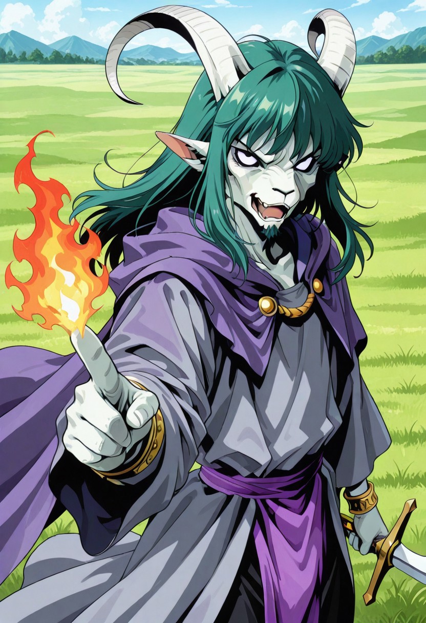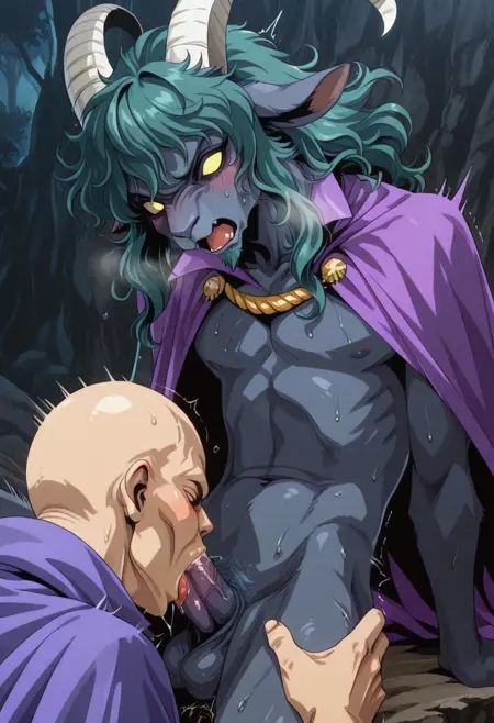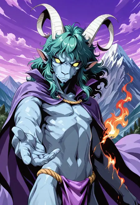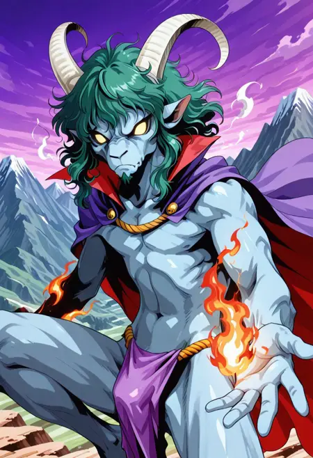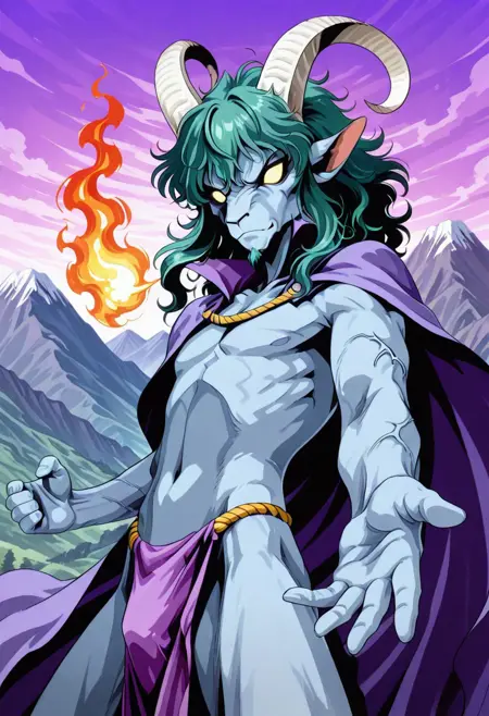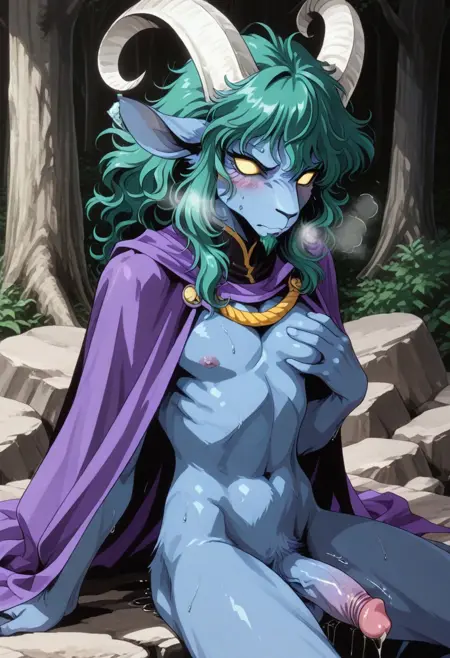 털 머리, 털 얼굴, 염소 머리 남자, 털 남자, 흰 뿔, 긴 뿔, 고트, 뾰족한 귀, 빛나는 눈, 노란 눈, 동공 없음, 털 피부, 진한 파랑 회색 피부, 진한 파랑 회색 얼굴, 물결치는 머리카락, 중간 길이 머리, 물결치는 앞머리, 어수선한 앞머리, 물결치는 옆머리, 턱에 붙은 옆머리, 녹색 머리카락, 고트, 남성적인 얼굴, 색이 있는 피부,