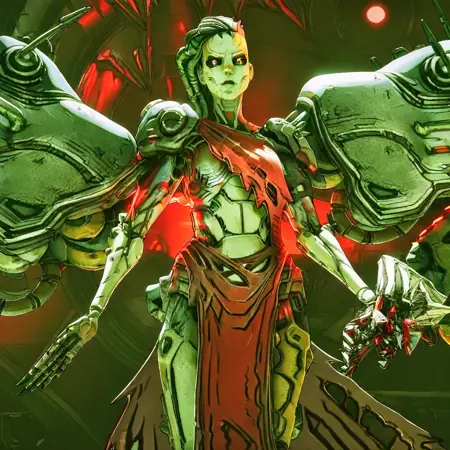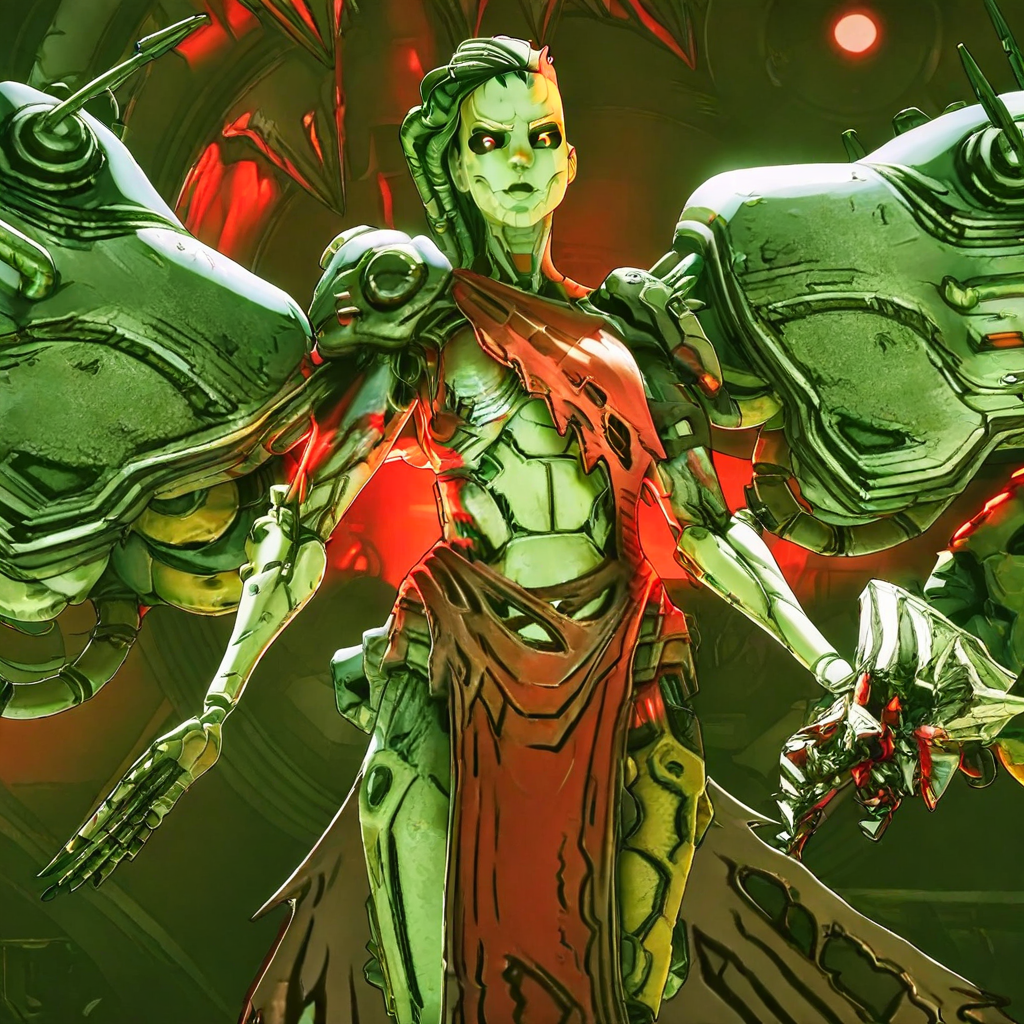 1girl, solo, robot, cyborg, red dress, torn clothes, black sclera, red eyes, long hair, mechanical hair, shaved sides of head, extra giant robot arms,