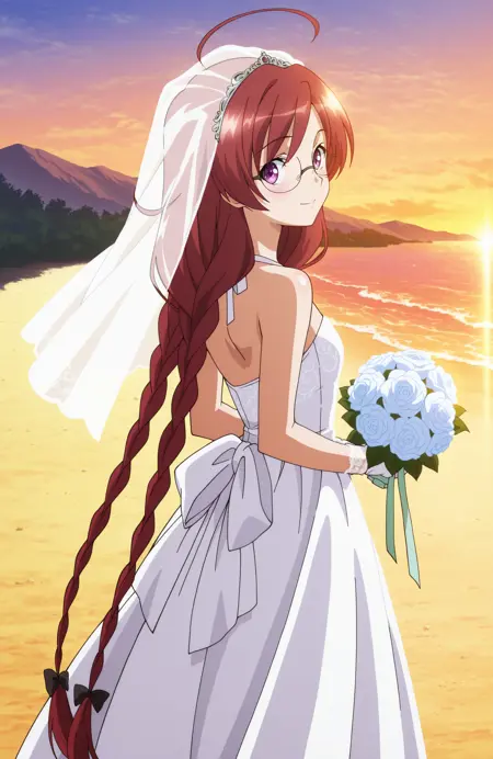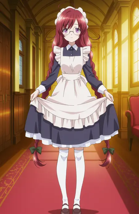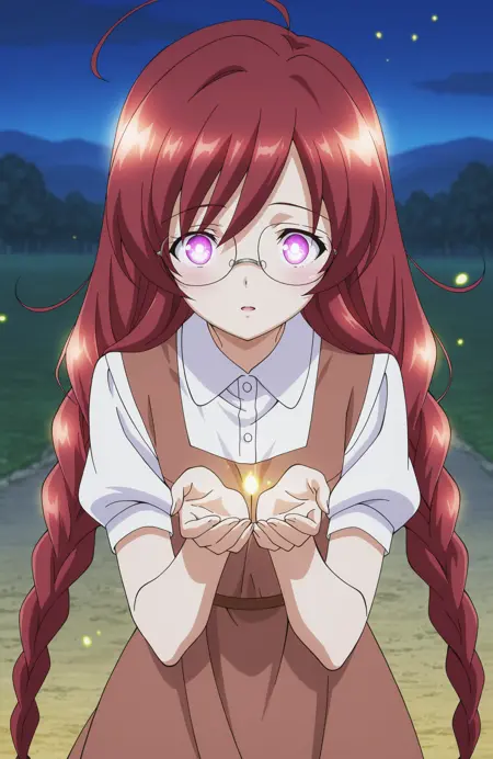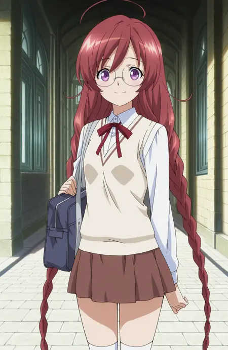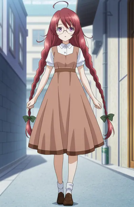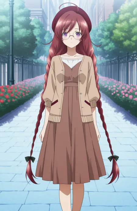 - KosameBP, 双子編み込み, メガネ, 編み込み, 長い髪, 紫色の目, アホ毛, 茶色の髪, 赤い髪, 非常に長い髪, 小さな胸,