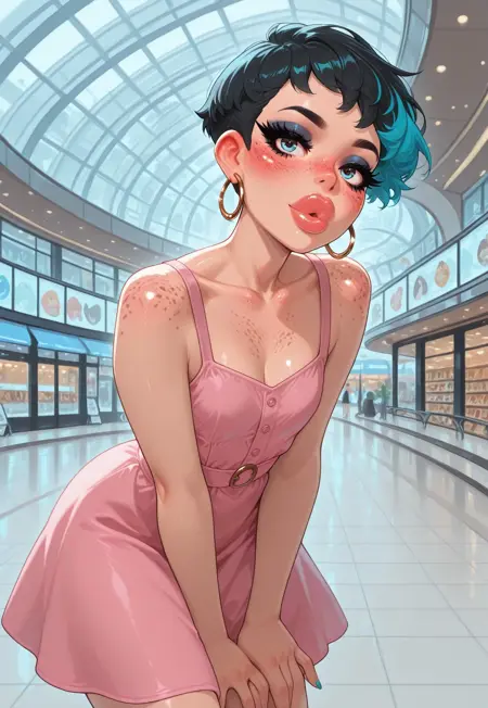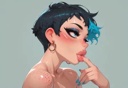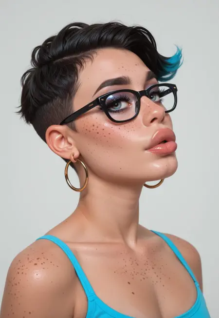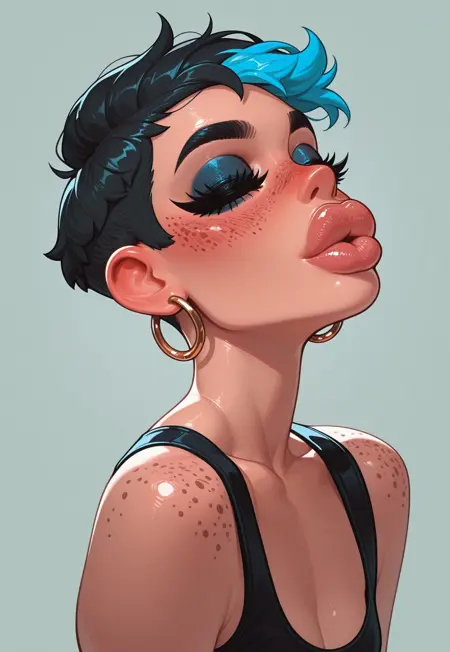 提示:dolly_prime, 1girl, femboy, 雀斑, 圆环耳环, 短发, 黑发配[颜色]挑染, 傻妞嘴唇, 长睫毛, 眼影,