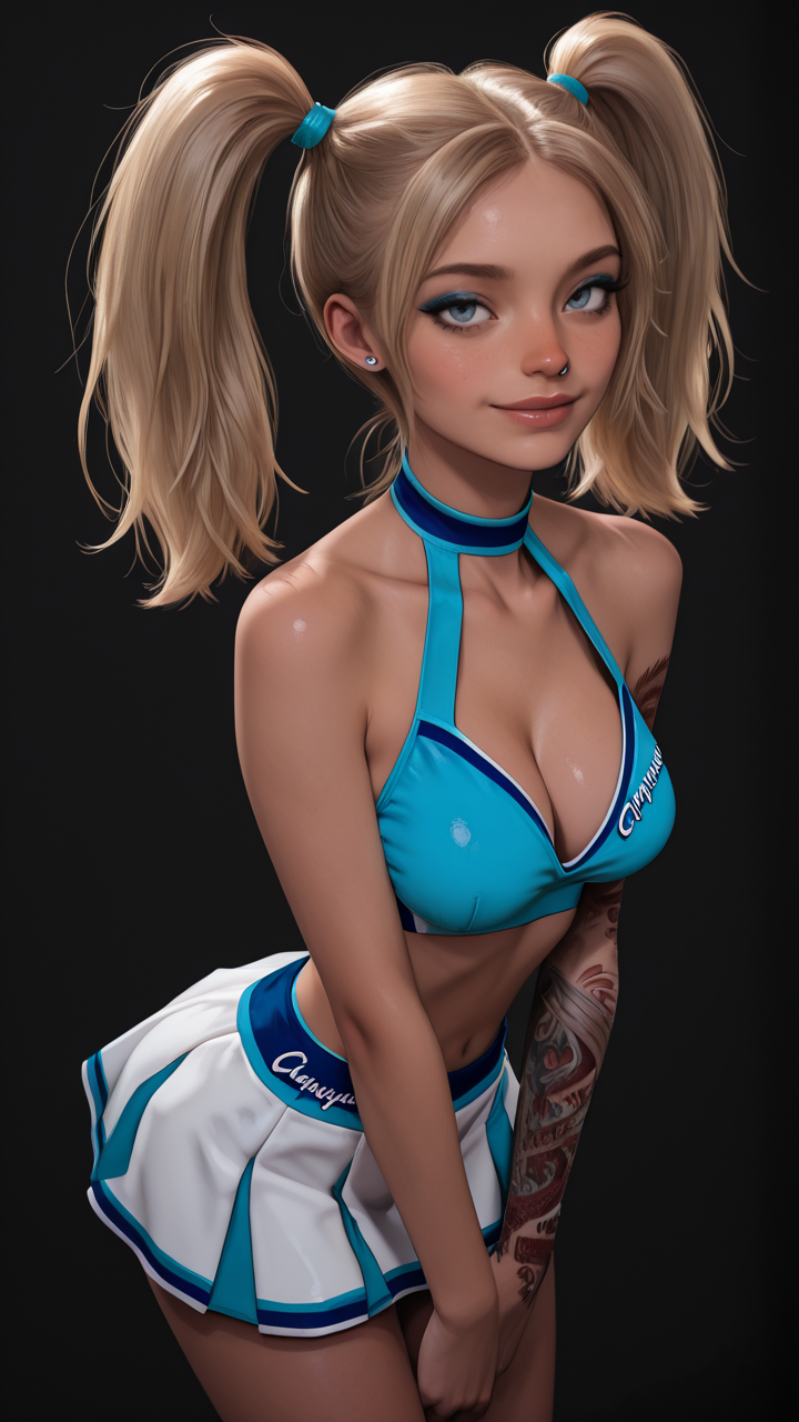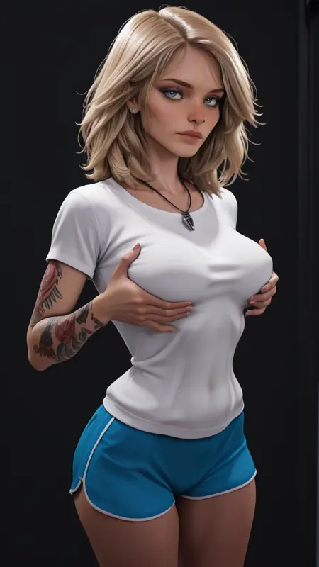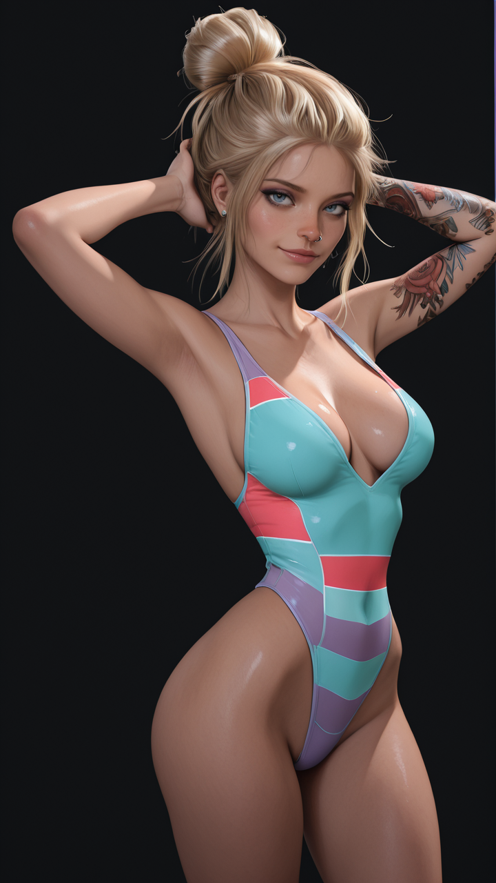 nika_ts_def, blonde hair, blue eyes, lips, medium breasts, lipstick, eyeshadow, eyeliner, nose piercing, nose ring, ear lobe piercings, sleeve tattoo, arm tattoo,