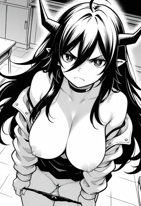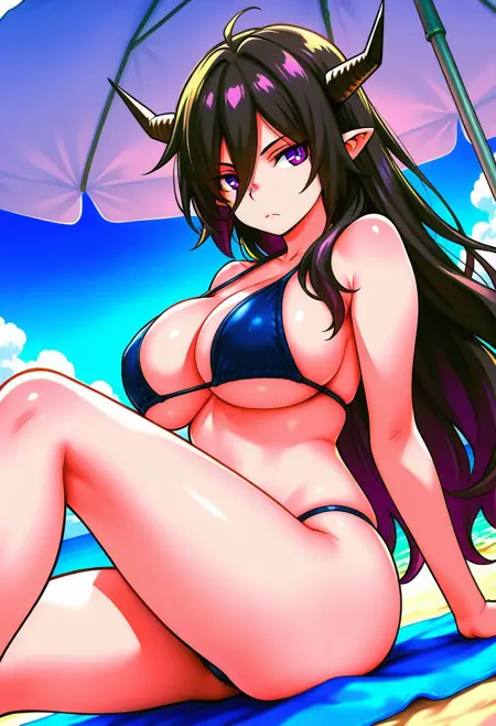 프롬프트: 망가, 컬러풀, 1소녀, 싱글, 에린, 유혹적인 시선, 뿔, 긴 머리, 뾰족한 귀, 가슴 선, 아호게, 큰 가슴, 자주색 눈, 기호 모양의 동공, 눈 사이의 머리카락, 검은 머리,