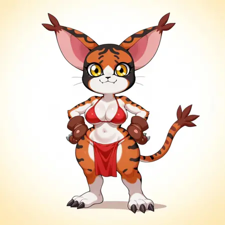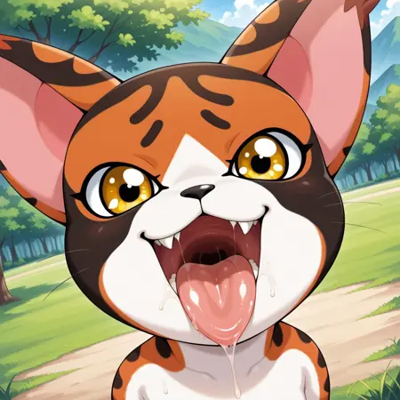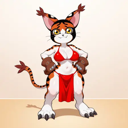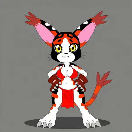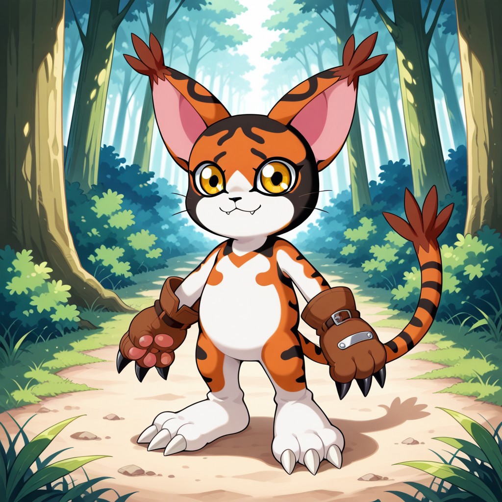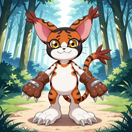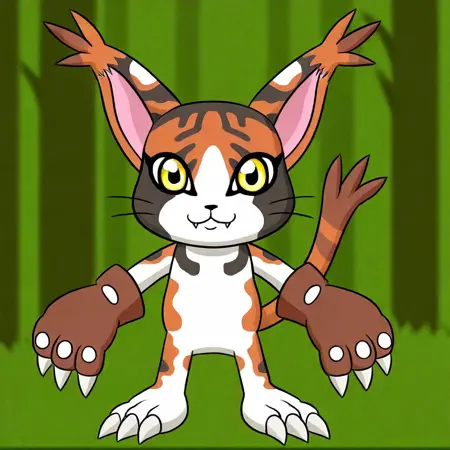 digimon (creature), cat, calico cat, white and brown fur, yellow eyes, cat ears, cat tail, fangs, claws, brown gloves,