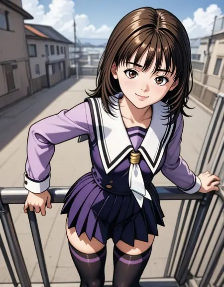 Yoshizuki iori, 1girl, solo, brown hair, brown eyes, bob cut, wanda high school uniform, black sleeveless dress, wide sailor collar, white sailor tie, pleated skirt, light purple long sleeves, white cuffs, black thighhighs, thighhighs with a lavender stripe at the top, black loafers,