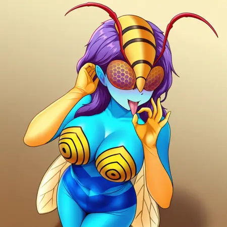bewon, 1girl, solo, monster girl, insect girl, tokusatsu, alien, large breasts, colored skin, blue skin, antennae, covered eyes, purple hair, wings, insect wings