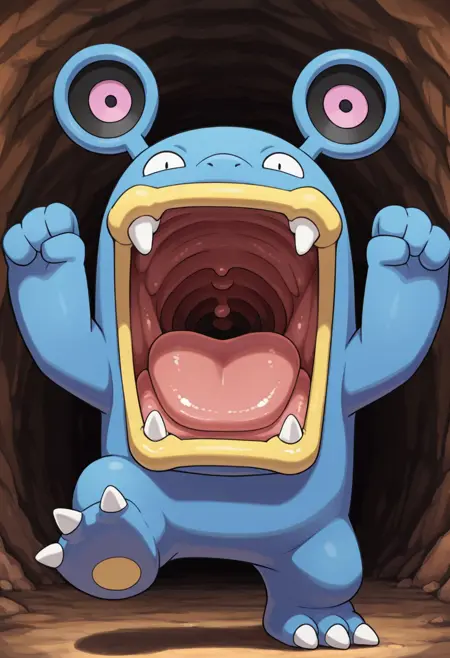 Loudred_Pkmn, blue fur, white eyes, four teeth, tan lips, circular ears, red circle in ears, two toenails