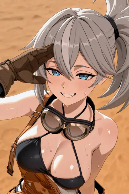 3biscuit_six_star_cos, criss-cross_straps bikini, black bikini, single strap overalls, brown overalls, brown gloves, black gloves, goggles around neck,