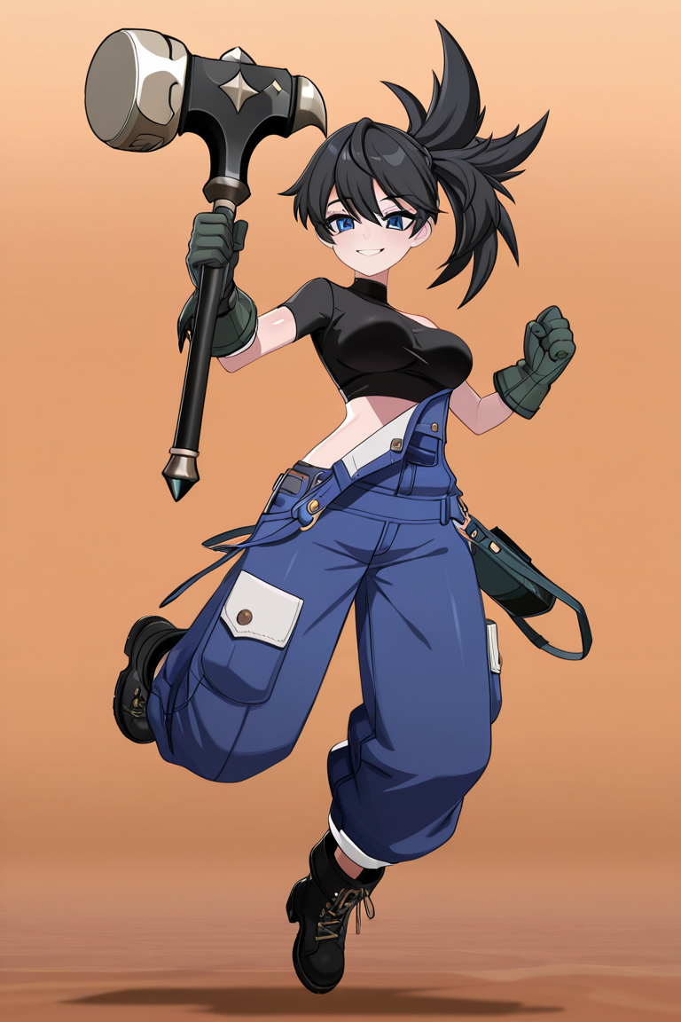 1biscuit_four_star_cos, midriff, black shirt, short sleeves, gloves, boots, overalls, single strap overalls, black footwear, blue overalls,