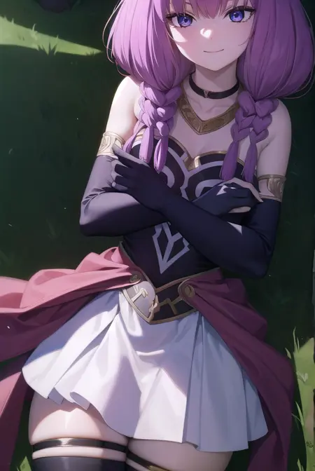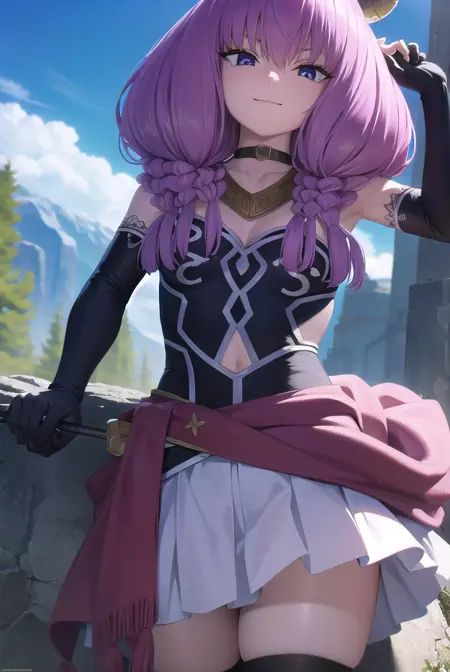 aura the guillotine, long hair, (purple eyes:1.1), purple hair, braid, horns, twin braids,