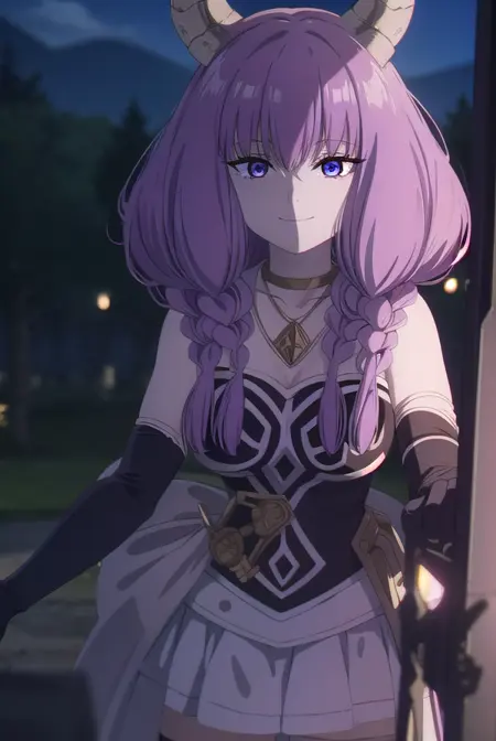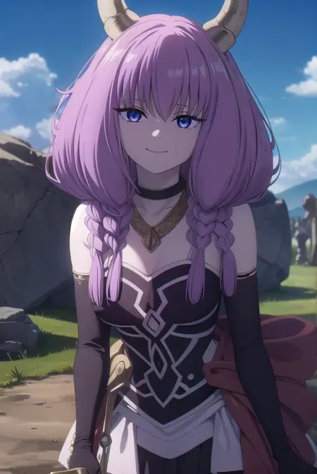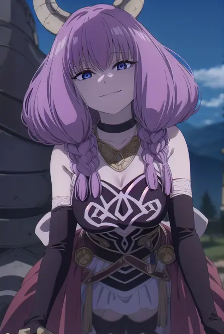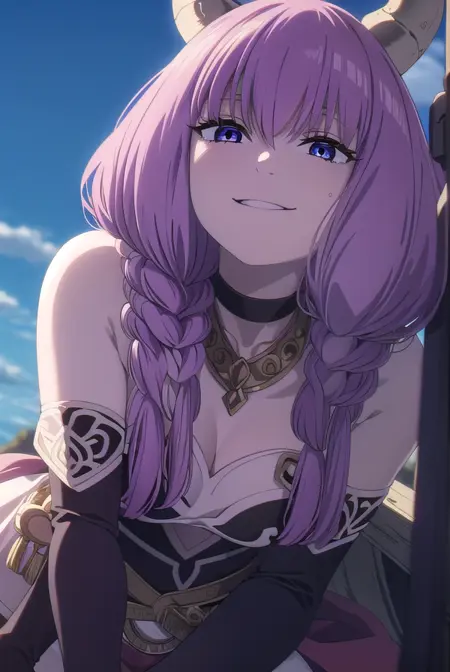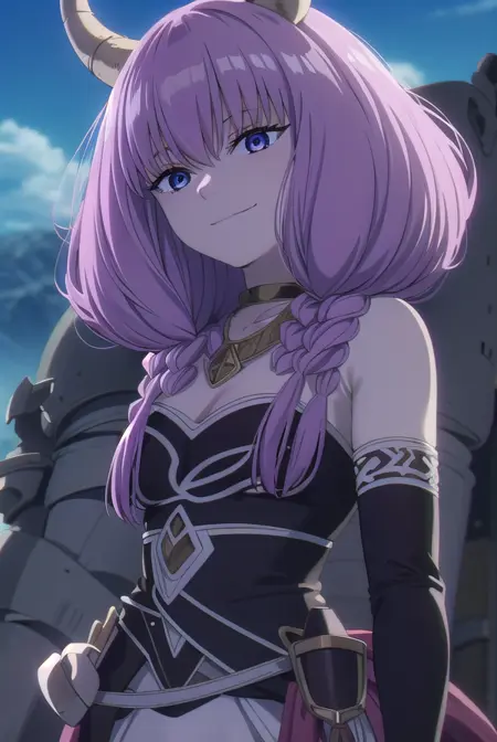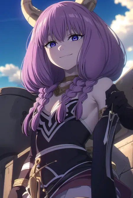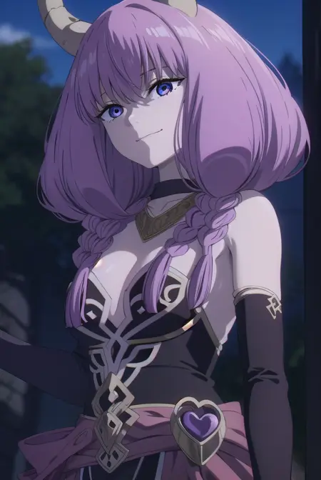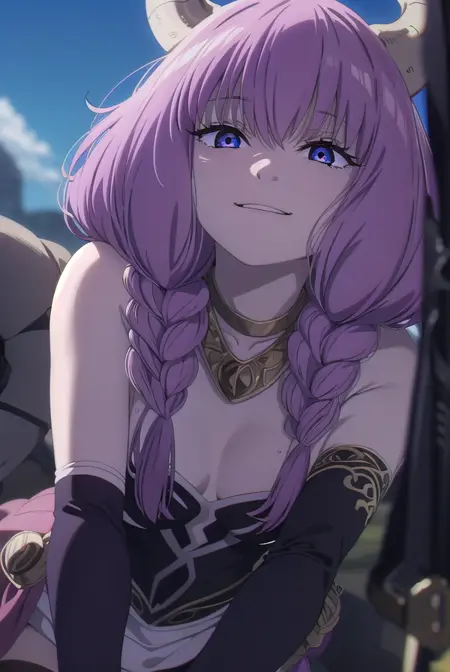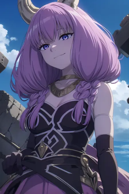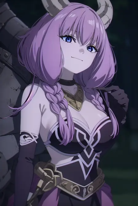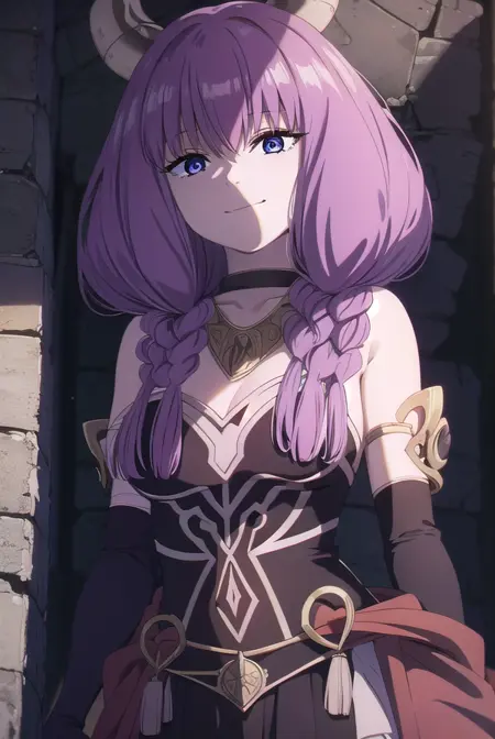 aura the guillotine, long hair, (purple eyes:1.1), purple hair, braid, horns, twin braids,