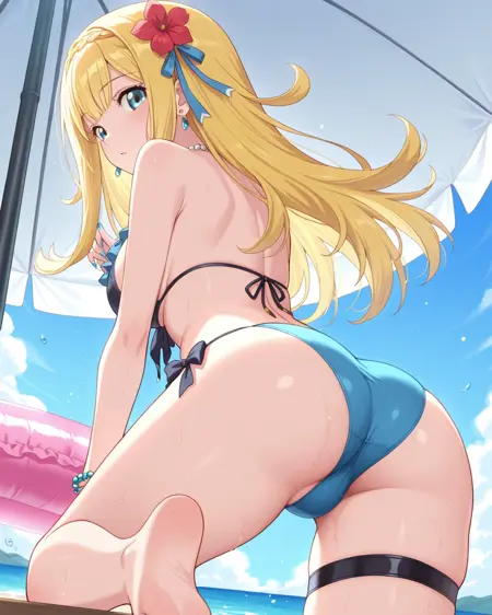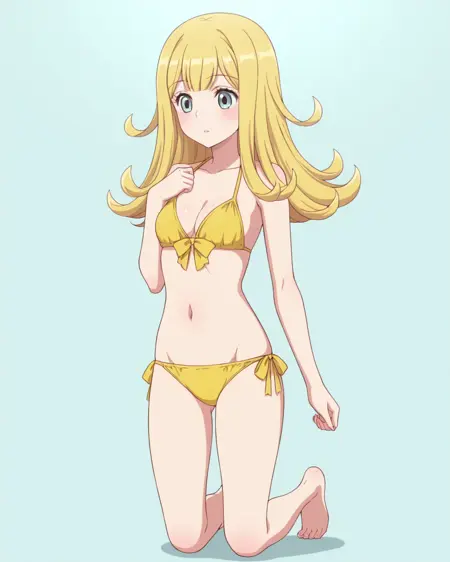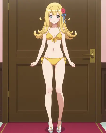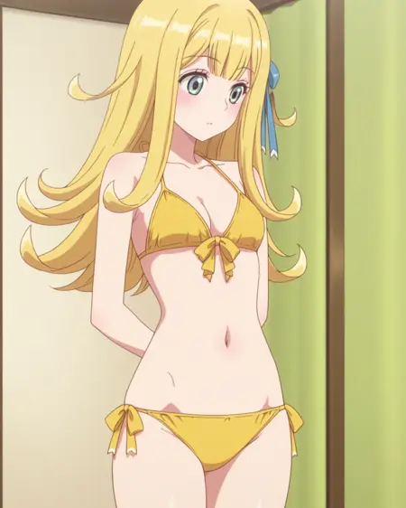 Lieselotte Homuross, Lieselotte, long hair, 1girl, solo, yellow bikini, cleavage, side-tie bikini bottom, ribbon, full body