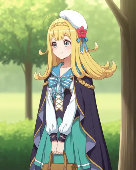 Lieselotte Homuross, Lieselotte, long hair, 1girl, solo, white hat, ahoge, flower, smile, outdoors, tree, cape, braid, beret, bag, skirt, long sleeves, blurry, blurry background, green skirt, bow, closed mouth