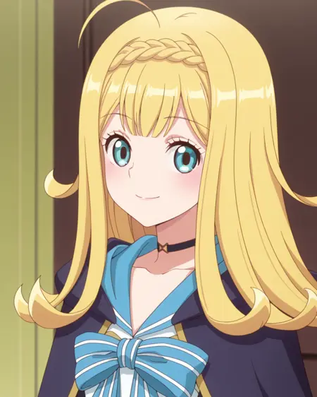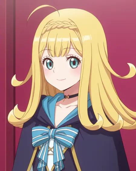 Lieselotte Homuross, Lieselotte, long hair, 1girl, solo, smile, ahoge, braid, choker, looking at viewer, upper body, crown braid, cloak, black choker, closed mouth