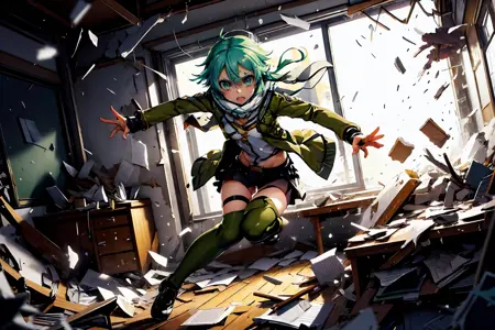 我是超人女英雄的粉丝,希望创作一幅因怪物袭击而导致房间坍塌的画面,人们在脚步声和破坏声中拼命逃生。我尝试使用Stable Diffusion,但无法获得我想象中飞溅碎片的效果,因此我创建了Lora。该Lora设定为表现一所完全坍塌的学校,但根据使用不同的Lora(角色),场景会相应变化,如测试所示。事实上,使用Asuna时,场景多为木制建筑房间;使用Takina时,则呈现木制咖啡馆风格的场景。因此,如果提示未指定地点,图像将显示与该角色关联的场所废墟。若希望指定特定地点,只需调整提示即可。