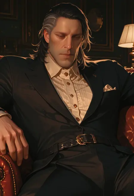 TW3Emhyr, 1boy, male focus, black hair, gray hair, multicolored hair, brown eyes, medium hair, mature male