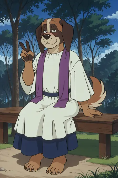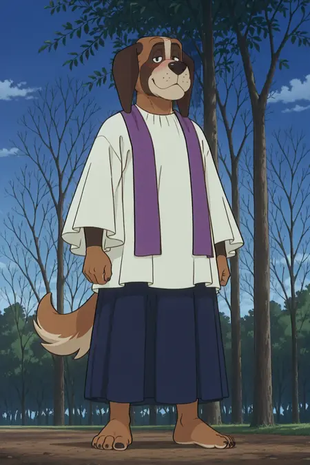 ➜ ReverendWilsonAWWFILXL, anthro furry, furry male, body fur, brown fur, brown body, older, mature male, 1boy, black eyes, dog tail, dog ears, purple stole, white dress, long sleeves, blue skirt, barefoot
