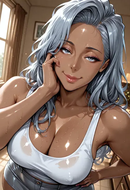 gracie, aged female, mature female, wrinkle, dark-skinned female, dark skin, cleavage, long hair, bare shoulders, wavy hair, white hair. grey hair, white tanktop, pencil skirt, lips,