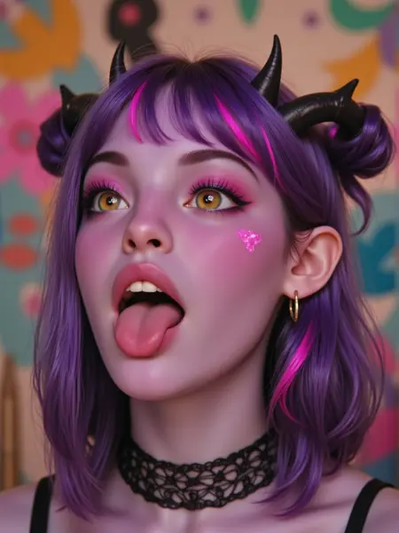 woman, medium hair, pink glowing glitters, facial marks, puffy hair, purple hair, pink glowing highlights, pointy ears, bangs, yellow glowing eyes, big cute eyes,