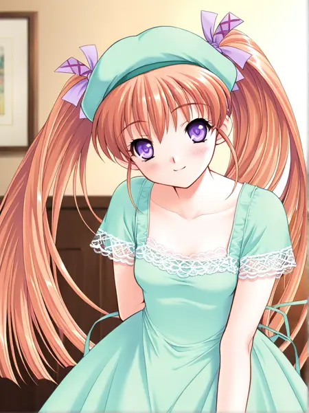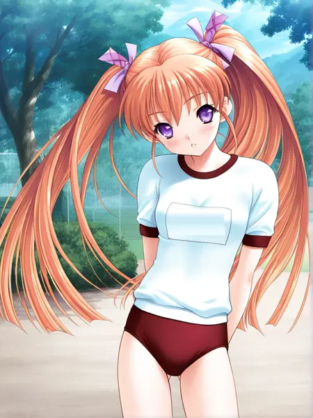 Miyamae_Rumina, 1girl, solo, long hair, twintails, orange hair, purple eyes, hair ribbon, purple ribbon, small breasts,