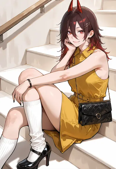 ** 외모:** 1소녀, 뿔, 악마 뿔, 빨간 뿔, 온이 뿔, 갈색 눈, 빨간 눈, 눈 사이의 머리카락, 빨간 머리, 검은 머리, 갈색 머리, 짧은 머리, 긴 머리, 중간 길이 머리, 입 아래 점, 앞머리, 악마 소녀