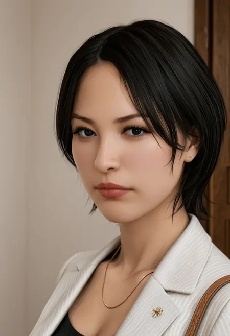 mafuyu_fujii, short hair, black hair, black eyes, makeup, lipstick