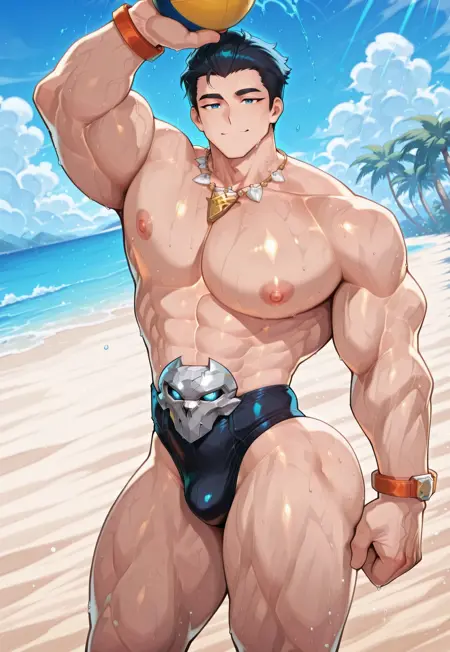 - 아쿠아 아senal/여름 스킨 생성 - 1boy, the punisher \(aqua arsenal\) \(marvel rivals\), 짧은 머리, 검은 머리, 뒤로 빗어올린 머리, 파란 눈, 둥근 안경, 흰색 목걸이, 선글라스, 목에 파란 수건, 상반신 노출, 검은 남성용 수영복, 생식기 부분에 두개골 무늬, 주황색 팔찌, 흰색 샌들, 흰색 플립플롭