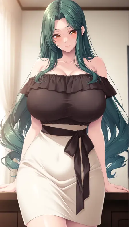 上東浜かな、緑髪、ロングヘア、カーテンヘア、サイドヘア、琥珀色の目