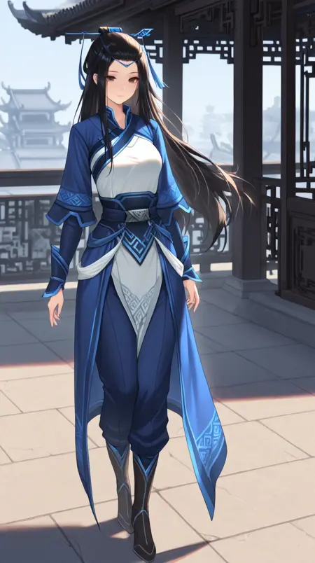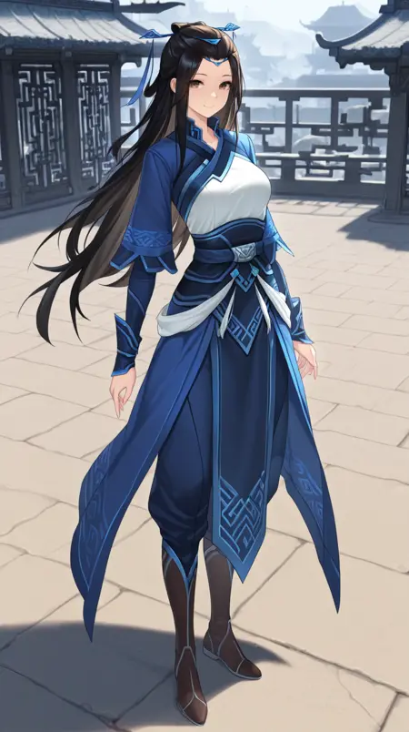 ling bo, 1girl, solo, black hair, chinese clothes, boots, sash, long hair, standing, brown eyes, full body, dress, long sleeves, rooftop, building, rock floor, outdoors, long robe, blue outer robe, blue long pants, layered outfit, ancient chinese architecture, medium breasts, hair ornament, long sleeves, sleeves covering arms, cuffs