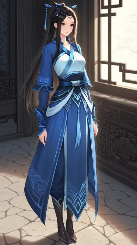 ling bo, 1girl, solo, black hair, long hair, full body, brown eyes, standing, chinese clothes, window, hanfu, indoors, stone floor, ancient chinese architecture, long robe, blue outer robe, blue long pants, layered outfit, boots, sash, medium breasts, hair ornament, long sleeves, sleeves covering arms, cuffs