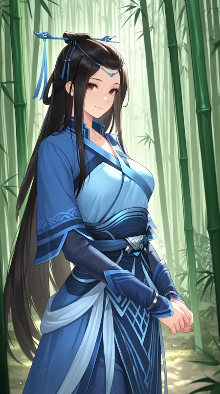 ling bo, 1girl, solo, nature, black hair, bamboo, forest, bamboo forest, brown eyes, chinese clothes, long hair, hair ornament, sash, outdoors, layered outfit, hanfu, layered sleeves, blue hanfu, traditional chinese robes, medium breasts, long sleeves, sleeves covering arms, cuffs, blue outer robe, blue long pants
