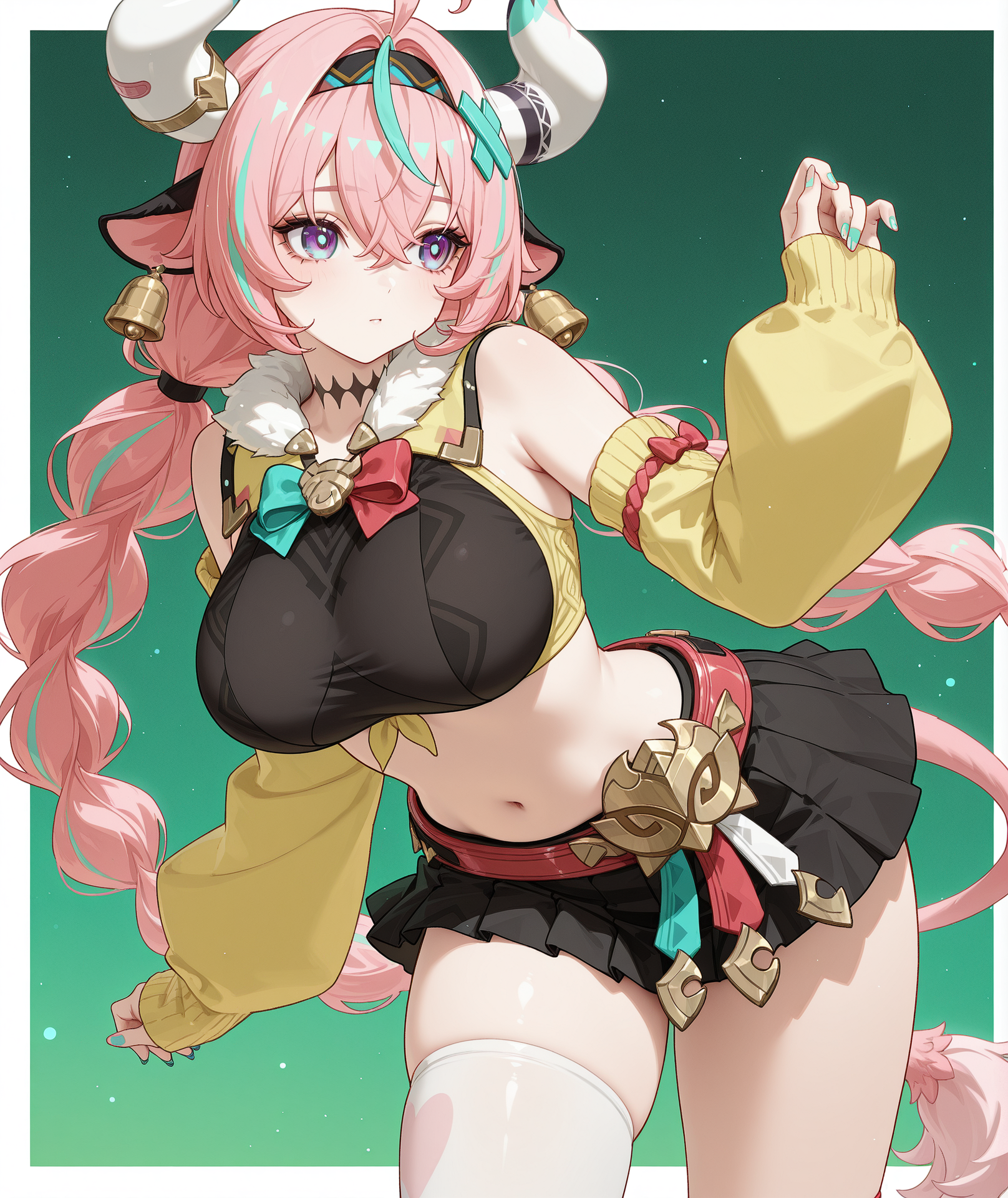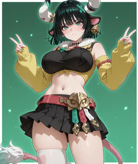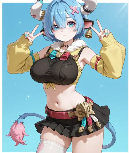 動物の耳、牛の耳、牛の角、角、X形の髪飾り、髪の巻き取り、尾、牛の女の子、牛の尾、