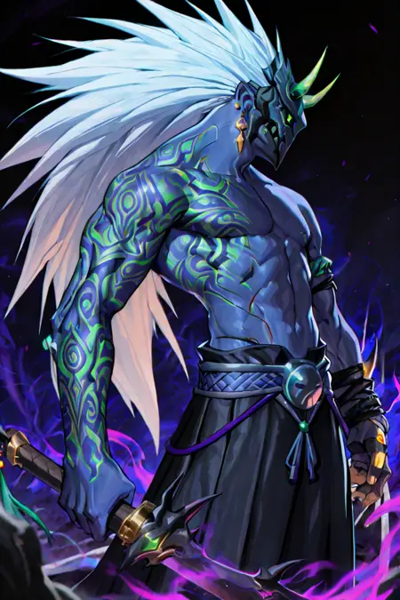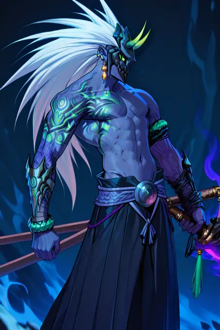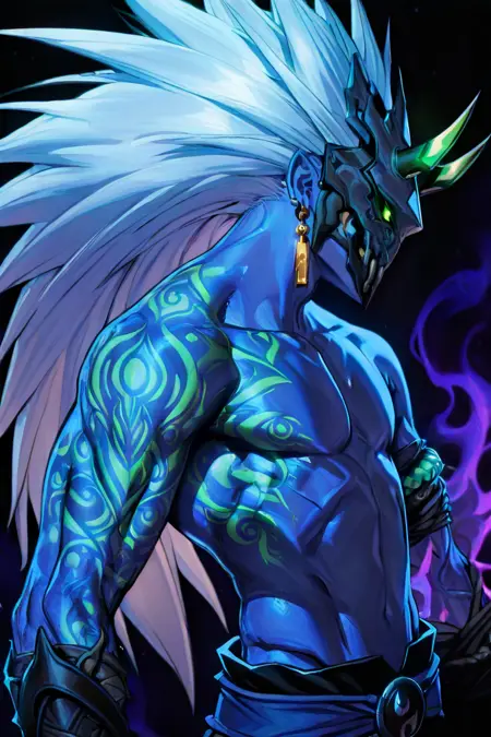 提示:sayun,面具,纹身,角,耳环,绿色眼睛,长发,蓝色皮肤,
