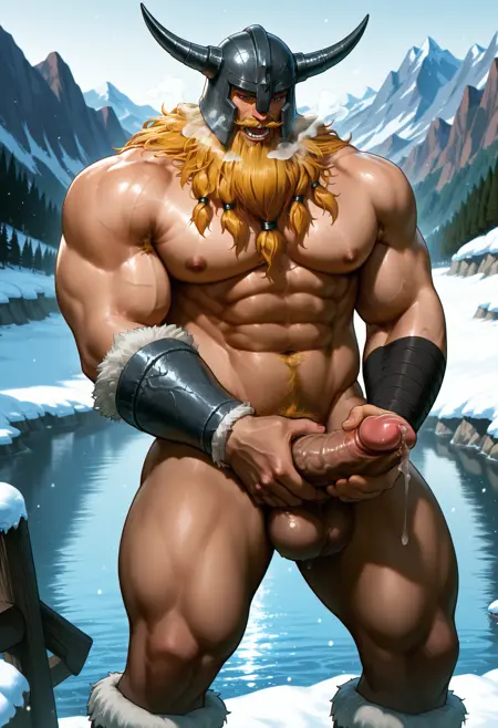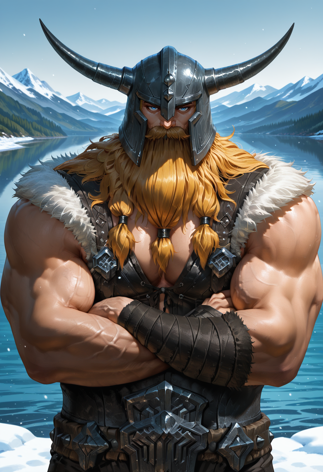 horned helmet, blonde hair, long hair, blue eyes, mustache, long beard, tied beard, muscular
