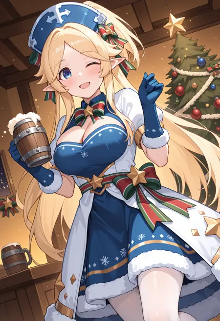 - pyukarmas、ハーフアップ、短いポニーテール、青い頭飾り、星\(シンボル\)、髪のリボン、多色リボン、多色のボウタイ、胸元、青いドレス、ゴールドのトリム、ファーのトリム、ふくらはぎ短い袖、白いコート、ドレスリボン、ファーのトリム、青い手袋、多色のリボン、白いタイツ、
