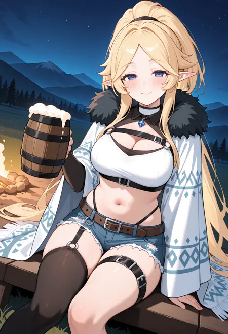 - pyukarcam、髪留め、広いポニーテール、黒いファー、ファーのトリム、白いマント、プリントマント、白いチョーカー、ペンダント、胸元カットアウト、胸ストラップ、黒いクロップトップ、白いクロップトップ、お腹部分、Oリング、ハイレグ、黒いストラップ、ベルト、デニムショートパンツ、短いショートパンツ、破れたショートパンツ、カットオフ、片側ガーター、片側シーリング、黒いシーリング、太ももベルト、太ももストラップ、