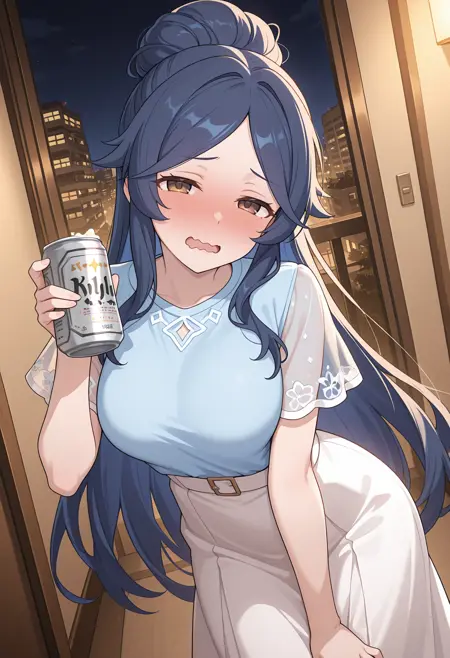 - 髪のブン、非常に長い髪、非常に長い髪、ハーフアップ、薄い青いシャツ、透け感のある袖、ショートスリーブ、白いスカート、