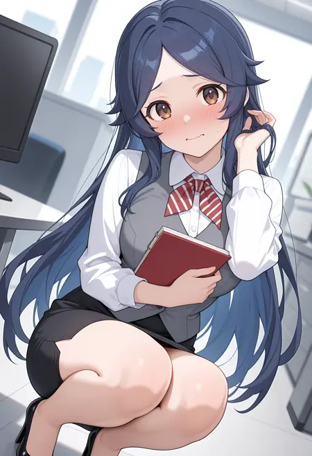 オフィスレディ、非常に長い髪、赤いリボン、ストライプのネックリボン、白いシャツ、グレーのベスト、ロングスリーブ、黒いスカート、ペンシルスカート、