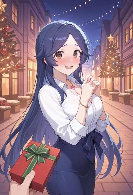 - 襟付きシャツ、非常に長い髪、非常に長い髪、非常に長い髪、白いシャツ、ロングスリーブ、ハートのネックレス、胸元、青いスカート、ペンシルスカート、ロングスカート、スカートリボン、ブレスレット、