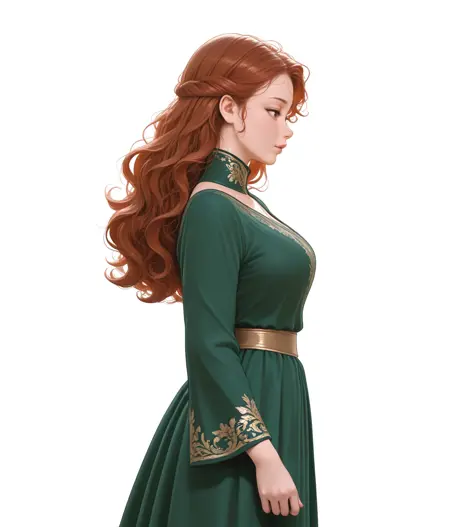 문이 열리고, 다시 한 번 왕실 경비대가 들어섰는데, 이번에는 한 여성이 동반했다. 그녀는 키가 크고 날씬하며, 블랙베리와 금색 비단으로 만든 드레스를 입고 있었고, 횃불빛 속에서 불꽃처럼 빛나고 있었다. 그녀는 붉은갈색 머리와 하얀 피부를 가진 아름다운 여인이었다. — 《검의 도난》, 제3장: 음모