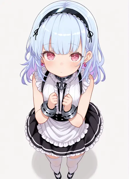 原版(origen): Dido \(碧蓝航线\),浅蓝色头发,长发,发带,红眼,齐刘海,露下乳,下乳切口,女仆围裙,耳环,手镯,裸露肩膀,白色腿饰,