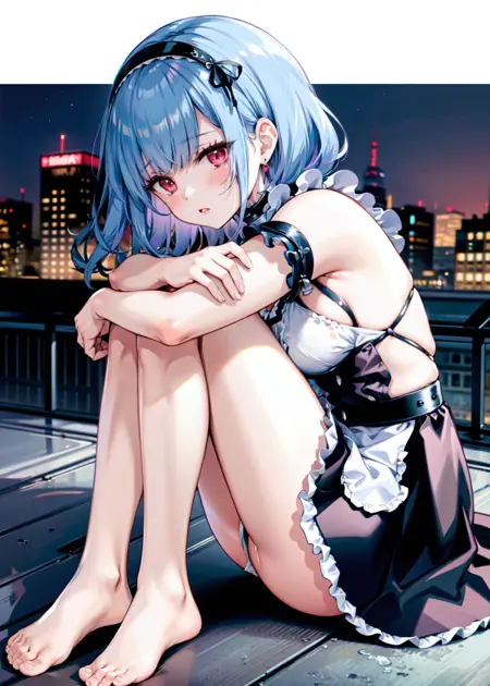 原版(origen):dido_\(azur_lane\), light blue hair, long_hair,hairband,red eyes,blunt bangs, underboob, underboob_cutout, maid_apron, earrings,bangle,bare shoulders, white legwear,