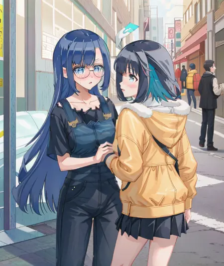 Touya long hair, glasses, black shirt, blush, collarbone, overalls