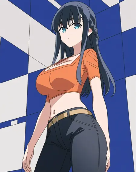 Kaori, midriff, belt, crop top, black pants, orange shirt