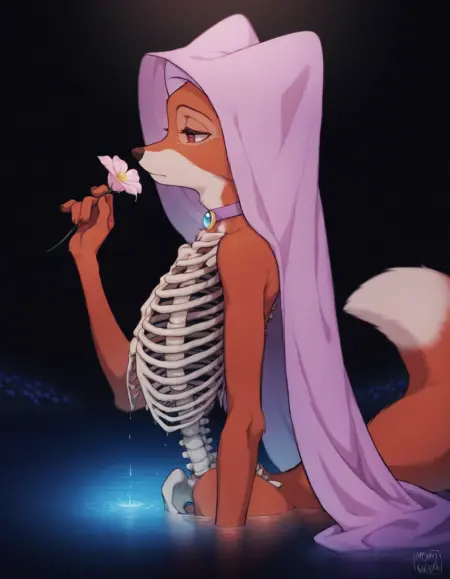 red fur skin, black eyes, fox tail, pink veil, pink dress, furry, fangs, fox