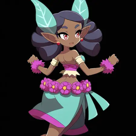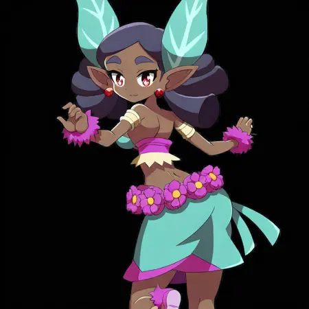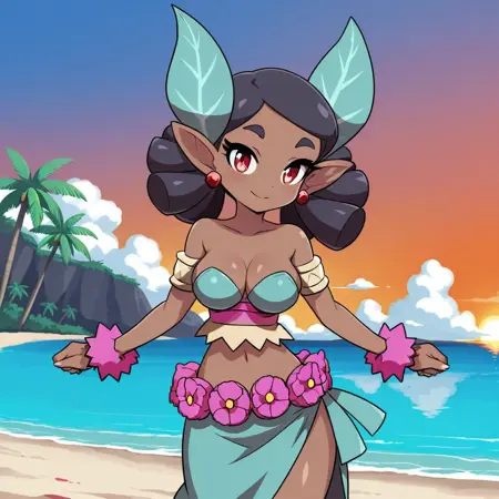 vera, 1girl, dark skin, red eyes, black hair, leaf hair ornament, earrings, pointy ears, jewelry, wrist scrunchie, large breasts, strapless bikini, skirt, flower belt, sandals,