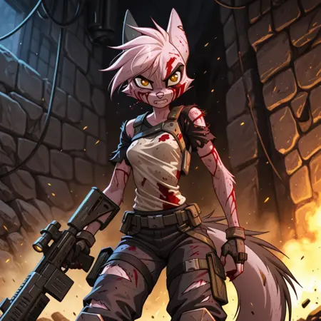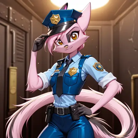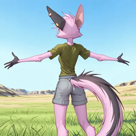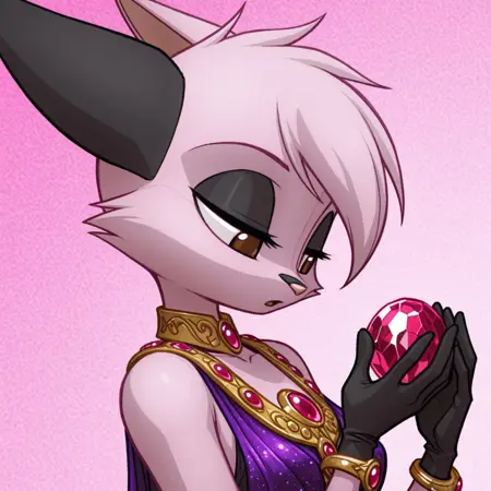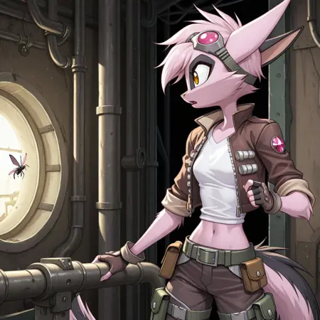 viriathus_vayu, dreamkeepers, 1girl, animal ears, furry, furry female, solo, tail, body fur, animal nose, short hair, pink hair, pink fur, yellow eyes, brown eyes, gloves,
