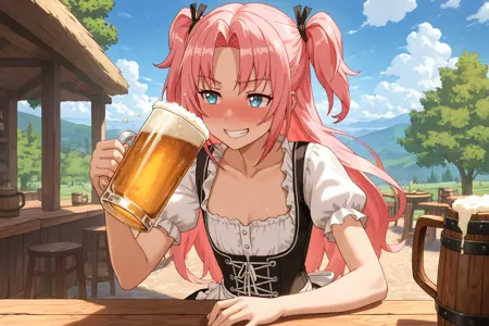 1소녀, 분홍색 머리, 긴 머리, 파란 눈, 헤어밴드, 갈라진 앞머리, 양쪽 위로 올린 머리