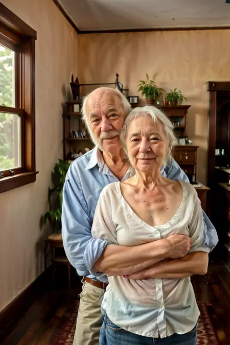 • 70세 통통한 남자, 긴 두꺼운 콧수염, 깎은 턱, 흰 머리가 흰색 오래된 스타일의 셔츠를 입고, 오래된 저택의 방에서, 창백한 피부, 명작, 행복한 표정으로 (깨끗한 턱의 마른 여자)를 안고 있는 모습, (미디엄 샷), 매우 상세, HDR, 4K, 니콘 k850